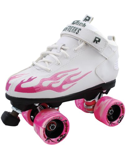 Sure-Grip , Rock's indoor low cut speed roller skates with flames featuring super speedy Sure-grip Twister wheels in 62mm X 96A. Cute and rockin'. - Speed Skates come in Men's Sizes - Ladies : Go down one size (Example: Ladies 8 = Men's 7) - Below Size 4 are Unisex Kids.